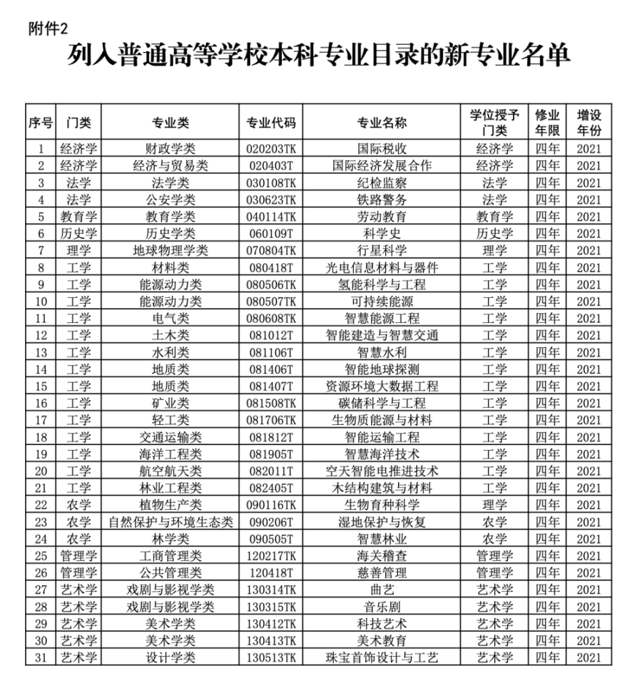 教育部公布的2021年度普通高等学校本科专业备案和审批结果显示,新增31种本科专业,涵盖工学、经济学、法学、艺术学等九大学科门类。