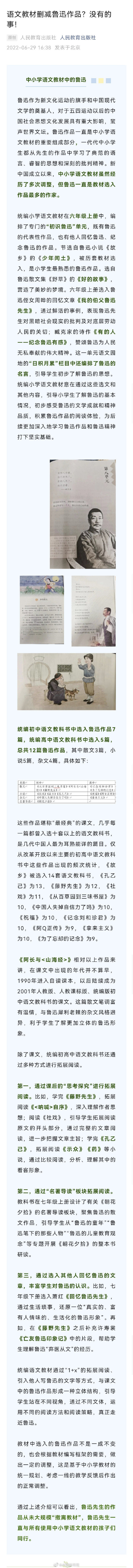 通过上述介绍可以看出,鲁迅先生的作品从未大规模“撤离教材”,鲁迅先生一直与所有使用中小学语文教材的孩子们同行。