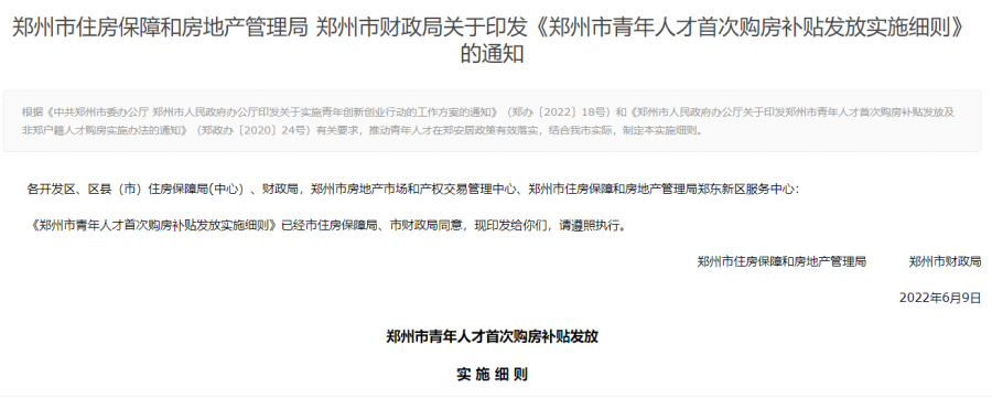 6月30日消息,郑州市住房保障和房地产管理局、郑州市财政局近日印发《郑州市青年人才首次购房补贴发放实施细则》,明确符合条件的全日制博士研究生、硕士研究生、本科毕业生(技工院校预备技师、技师)、专科(不含中专)毕业生,在郑州市首次购买住房,可发放购房补贴,具体标准为博士每人10万元,硕士每人5万元,本科毕业生(技工院校预备技师、技师)每人2万元,专科毕业生每人1万元。