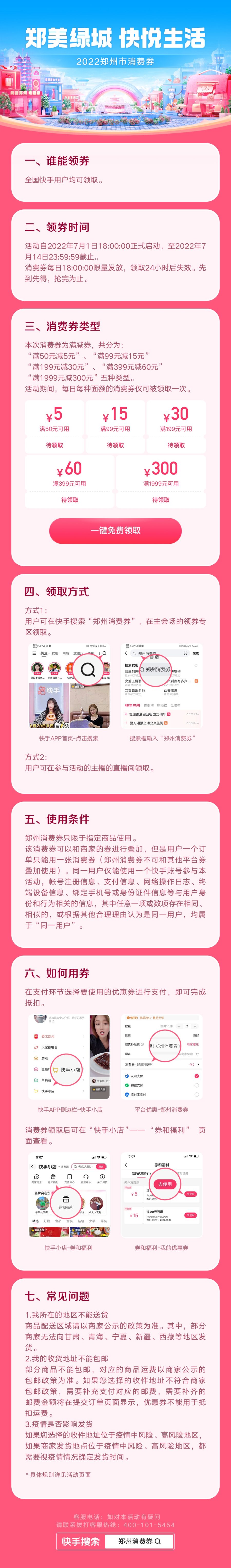 怎么领!7月1日-14日,每天下午18:00在快手平台准时发放!方式一:全国消费者均可在快手APP内搜索“郑州消费券”,在主会场的领券专区领取;方式二:在快手电商官方账号“快手小店”直播间,或参与活动的百余位主播直播间内领取。划重点——同一用户每天每个面额限领1张,一个订单限用1张。