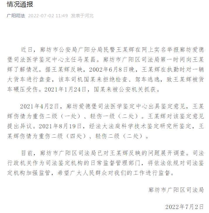 近日,廊坊市公安局广阳分局民警王某辉在网上实名举报廊坊爱德堡司法医学鉴定中心主任马某昌。廊坊市广阳区司法局第一时间向王某辉了解情况。据王某辉反映,2002年6月8日晚,王某辉在执勤时对一辆大货车进行盘查,该车司机国某来拒绝检查、驾车逃逸,致王某辉被货车碾压受伤。2021年1月24日,国某来被公安机关抓获。
