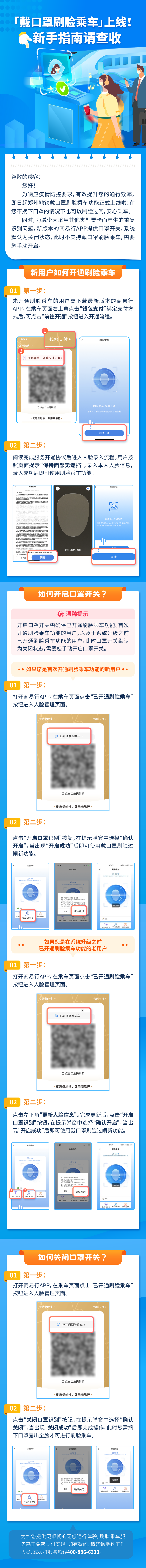 为全力做好疫情防控工作,有效切断疫情传播途径,郑州地铁自年初暂停使用刷脸乘车功能并开始全线维护升级。即日起,乘客登录最新版郑州地铁·商易行APP,在“乘车”界面录入面部信息并开启口罩识别功能(原有刷脸用户需点击“更新人脸信息”更新面部信息,并确认开启口罩识别功能),刷脸进出地铁站无需摘口罩,直接过闸乘车,降低疫情交叉感染的风险。此外,由于功能升级维护暂停的每周五商易行会员限量一万次1分钱刷脸乘车优惠活动也将同期恢复。
