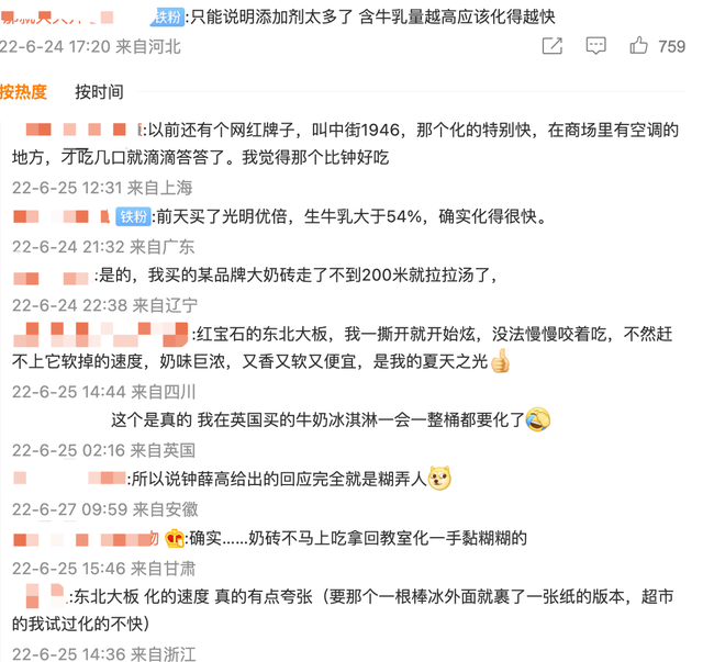在评论区,很多网友分享了自己买的雪糕融化的经历,多名网友表示,牛奶含量高的雪糕更容易融化。