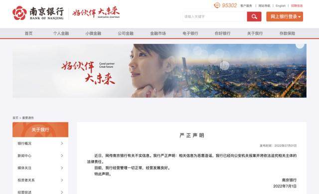 “近日,网传南京银行股份有限公司有关不实信息。公司郑重声明:相关信息为恶意造谣,公司已经向公安机关报案并将依法追究相关主体的法律责任。目前,公司经营管理一切正常,经营发展良好。”7月1日晚间,南京银行股份有限公司发布公告称。