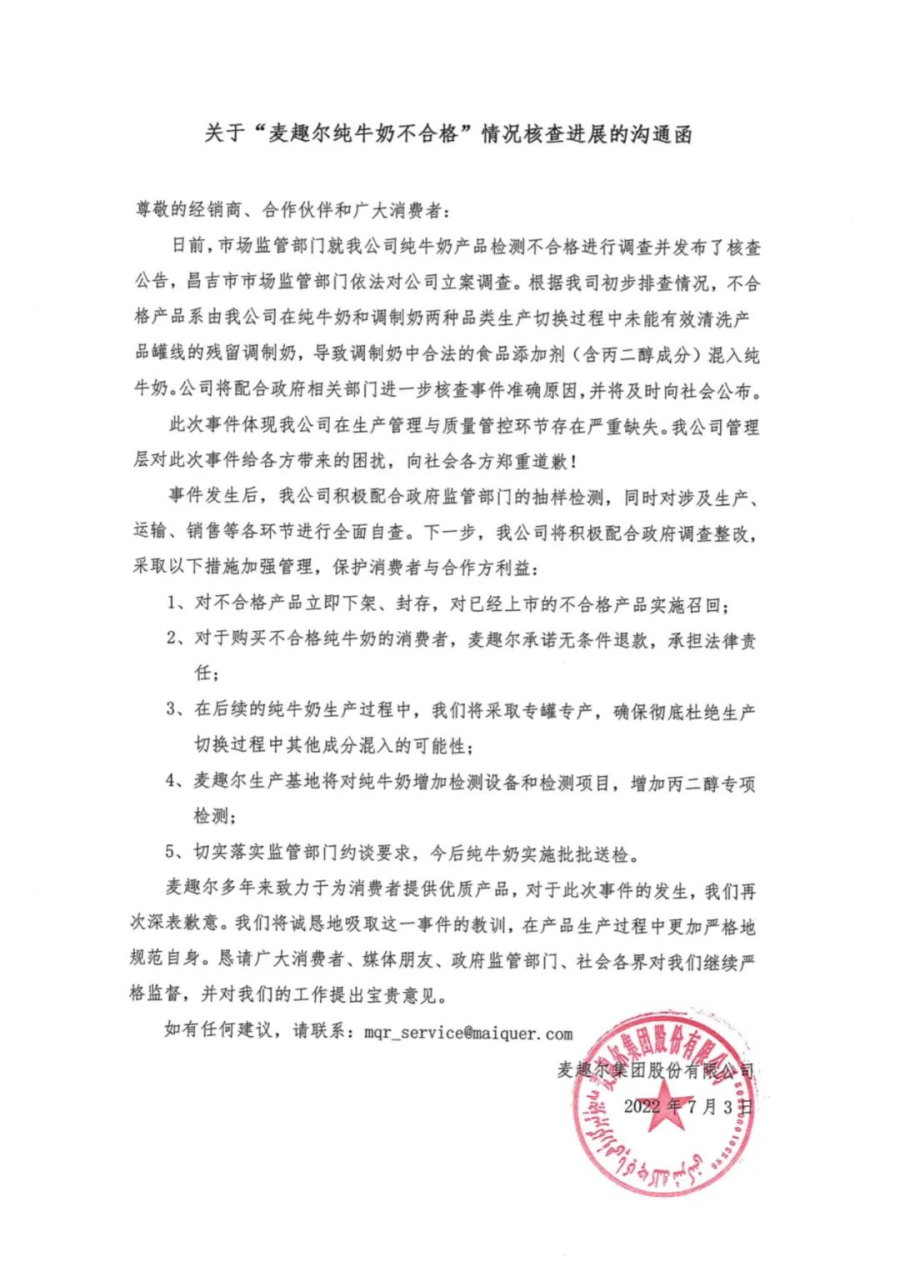 7月3日,麦趣尔乳业微信公众号发布关于“麦趣尔纯牛奶不合格”情况核查进展的沟通函,公布了初步自查结果,称不合格产品由公司在纯牛奶和调制奶两种品类生产切换过程中未能有效清洗产品罐线的残留调制奶,导致含有丙二醇的调制奶混入纯牛奶中。称公司将配合政府相关部门进一步核查事件准确原因,并将及时向社会公布。此次事件体现公司在生产管理与质量管控环节存在严重缺失。
