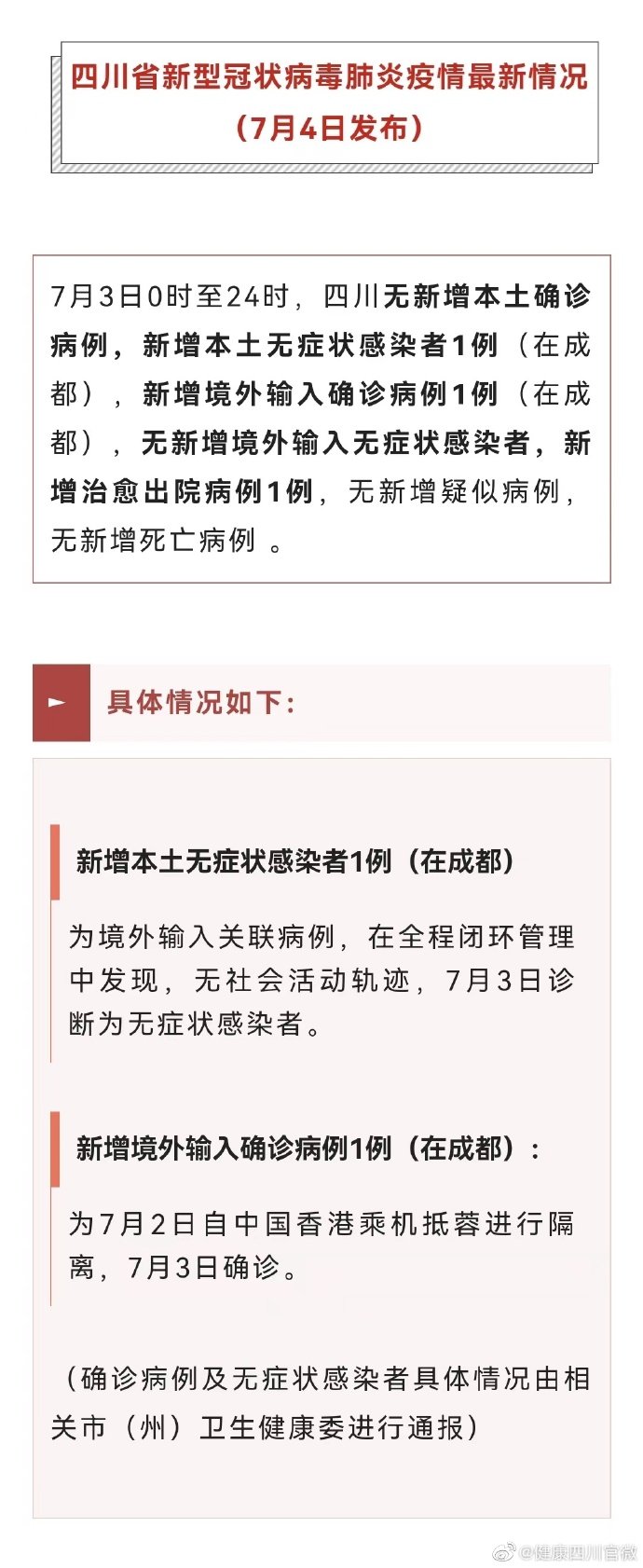 7月3日0时至24时,四川无新增本土确诊病例,新增本土无症状感染者1例(在成都),新增境外输入确诊病例1例(在成都),无新增境外输入无症状感染者,新增治愈出院病例1例,无新增疑似病例,无新增死亡病例。