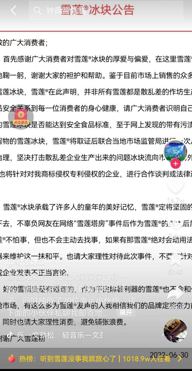 另,该抖音账号还发布公告称,网上发现的带有污渍和残留物的雪莲冰块,雪莲将取证后联合当地市场监管局进行一次从严的治理,坚决打击散乱差企业生产出来的问题冰块流向市场,另外雪莲也将针对对其商标侵权专利侵权的企业,进行合作谈判或法律追诉。
