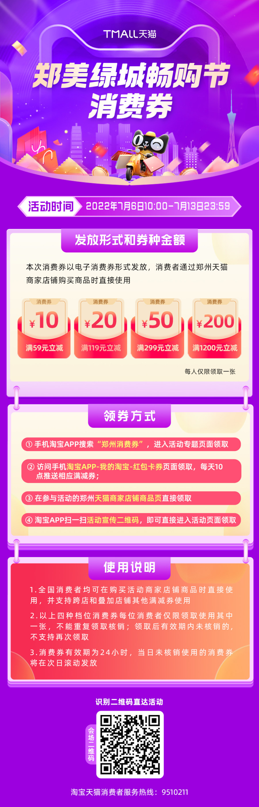 怎么领!7月6日-13日,每天上午10:00在天猫平台准时发放。方式一:手机淘宝APP搜索“郑州消费券”,进入活动专题页面领取;方式二:在参与活动的郑州天猫商家店铺商品页直接领取。划重点——全国消费者皆可领取,每日数量有限,先到先得!