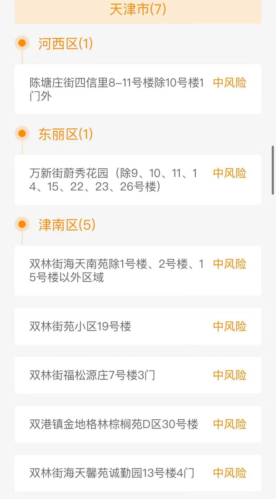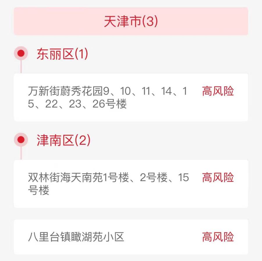 记者根据国家政务服务平台查询到,截止7月5日23时,天津共有3个高风险地区,7个中风险地区,分布在河西区、东丽区和津南区。