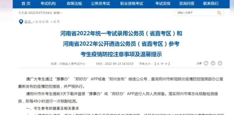 根据6月23日河南省人事考试中心发布的《河南省2022年统一考试录用公务员(省直考区)和河南省2022年公开遴选公务员(省直考区)参考考生疫情防控注意事项及温馨提示》,请广大考生通过“豫事办”“郑好办”APP或者“郑州发布”微信公众号,查询郑州市新冠肺炎疫情防控指挥部办公室最新发布的疫情防控措施,并严格执行。
