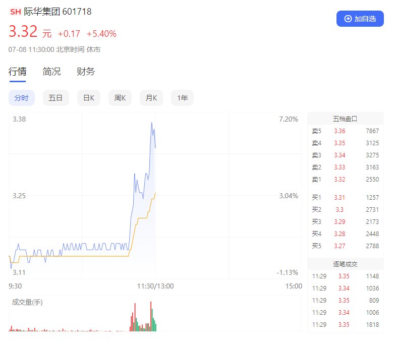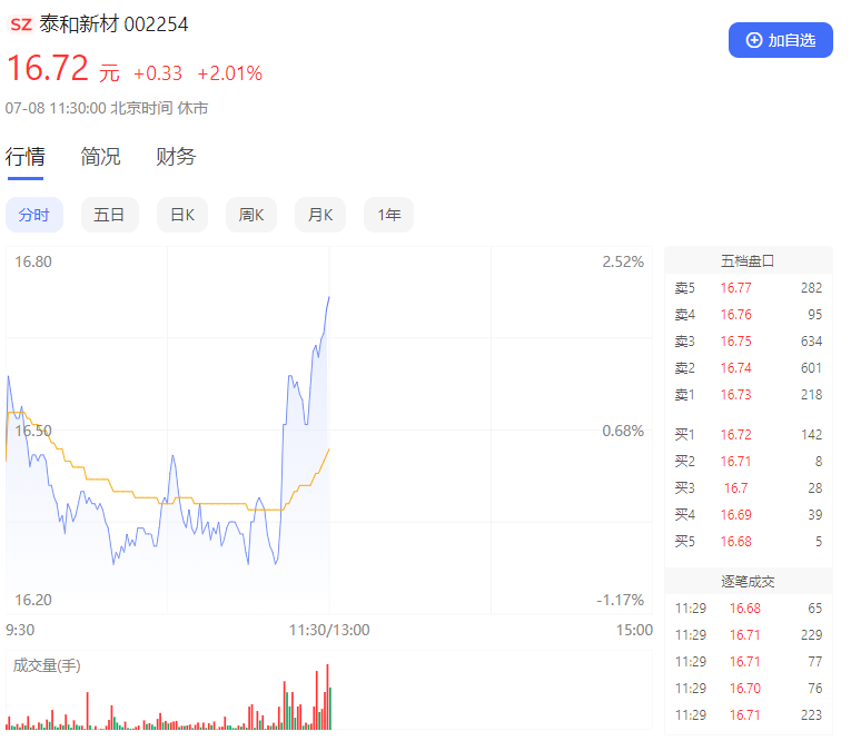 截至8日中午休市,泰和新材报16.72元,涨幅2.01%,际华集团报3.32元,涨幅5.4%。
