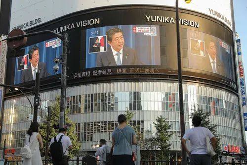 8月28日,日本东京一处电子屏幕播放安倍晋三在记者会上正式表达辞职意向的画面。
