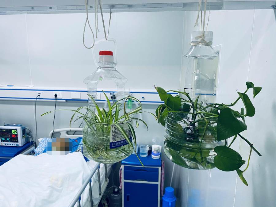 (床位上方挂着绿植)