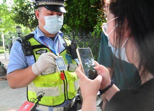 当值勤交警发现电动车、非机动车交通违法后,会让当事人用微信扫执勤胸卡背面的二维码,当事人扫码后,会出现“智慧劝导岗”页面,显示“车牌号、姓名、联系方式、身份证号、工作单位”等信息,当事人认真填写个人信息。