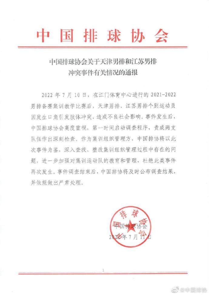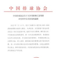 中国排球协会发布关于天津男排和江苏男排冲突事件有关情况的通报: