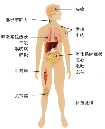 在感染艾滋病病毒初期,大多数患者临床症状轻微,持续1-3周后缓解。临床表现以发热最为常见,可伴有咽痛、盗汗、恶心、呕吐、腹泻、皮疹、关节疼痛、淋巴结肿大和神经系统症状。进入艾滋病期后,患者可出现持续一月以上的发热、盗汗、腹泻,体重减轻10%以上,部分患者出现神经精神症状。