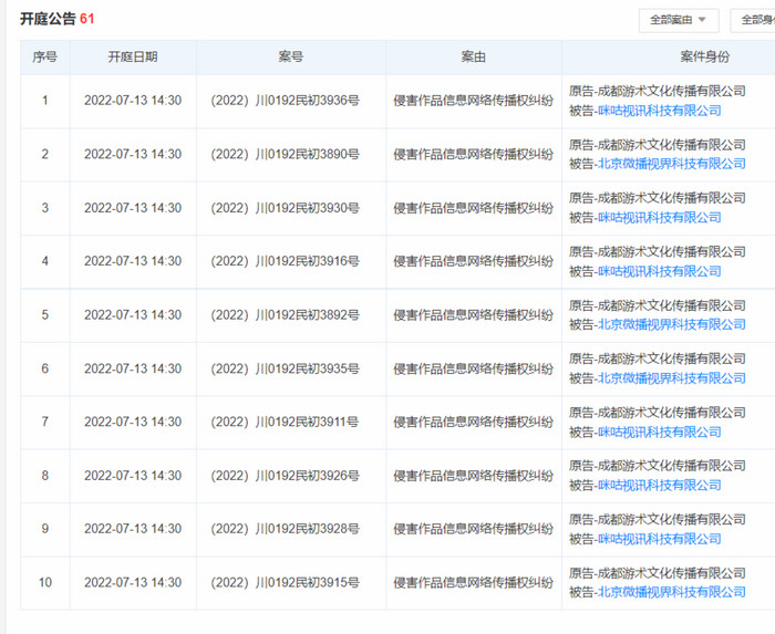 天眼查显示,目前成都游术文化传播有限公司“起诉他人或公司的开庭公告”共有61条,B站、抖音、咪咕、小红书、爱奇艺、腾讯、快手、百度、搜狐、乐视网、优酷、华为等均成为被告。