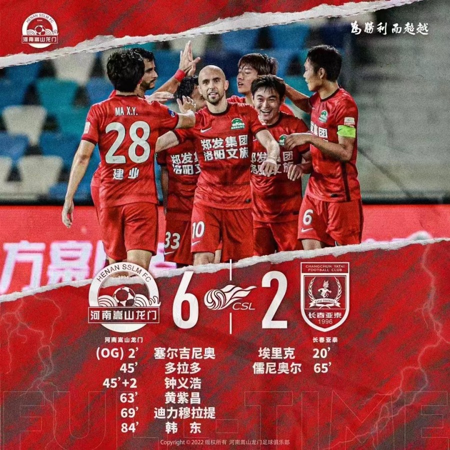一直期待嵩山龙门能够击败亚泰打破多年不胜对手历史的河南球迷也不会想到,魔咒终于打破,而且竟然是以创纪录的方式。7月11日晚上在海口,河南嵩山龙门6:2大胜老对手长春亚泰,不仅终结了十年未曾战胜过对手的历史,而且创下了球队在中超历史上的单场进球最多记录,同时嵩山龙门也和武汉三镇一起,成为今年中超联赛中唯二的单场打进6球的队伍。