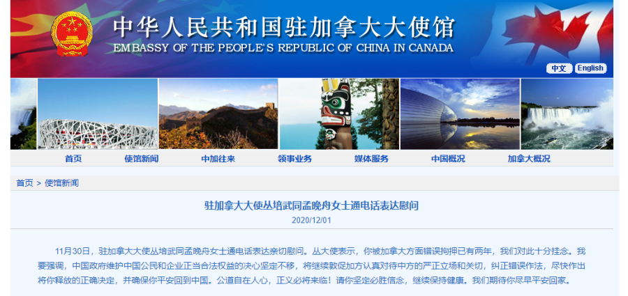11月30日,驻加拿大大使丛培武同孟晚舟女士通电话表达亲切慰问。