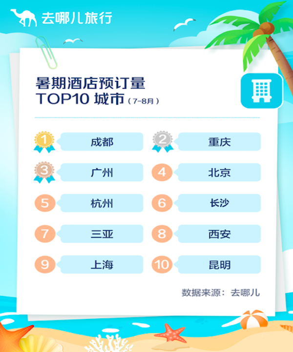 去哪儿平台数据显示,今年暑期(7~8月)酒店预订量TOP10城市是:成都、重庆、广州、北京、杭州、长沙、三亚、西安、上海和昆明。其中成都、重庆和三亚延续今年以来的热门趋势,而北京、上海则是重回TOP10城市。据悉,为了促进北京旅游市场恢复,北京市文化和旅游局向消费者陆续发放京郊住宿消费券。凯悦酒店集团亚太区销售、收益及分销渠道副总裁黄勤辉告诉记者,随着暑假来临,上海旅游市场的需求量增长,上海金茂君悦大酒店迎来了暑期预订量的增长。而随着周边游成为热门出行方式,凯悦位于上海崇明等地的酒店预订量也迎来明显增长。