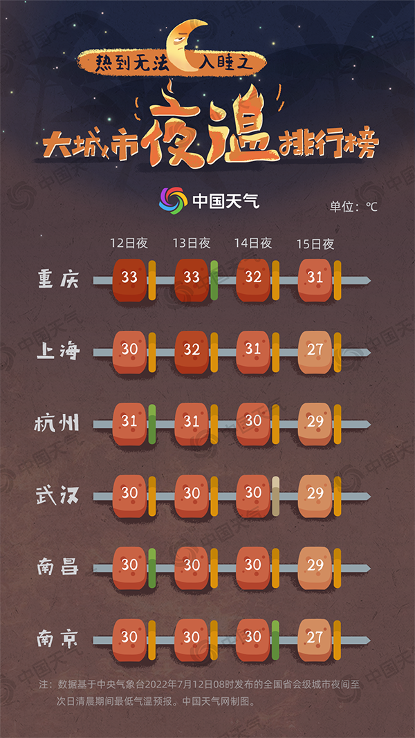 最近几天,南方高温堪称天气圈的“劳模”,每天来得早走得晚,白天兢兢业业冲击40℃,晚上恋恋不舍发挥余热,多地维持30℃不掉线。网友纷纷表示:晚上睡觉都靠空调续命,上个厕所汗流浃背,电风扇都热成了电吹风。未来三天(7月12日至14日),江浙沪和川渝一带的夏夜依然焖蒸难耐,中国天气网推出全国夜间火炉地图和大城市夜温排行榜,看看谁是真正夜温王。
