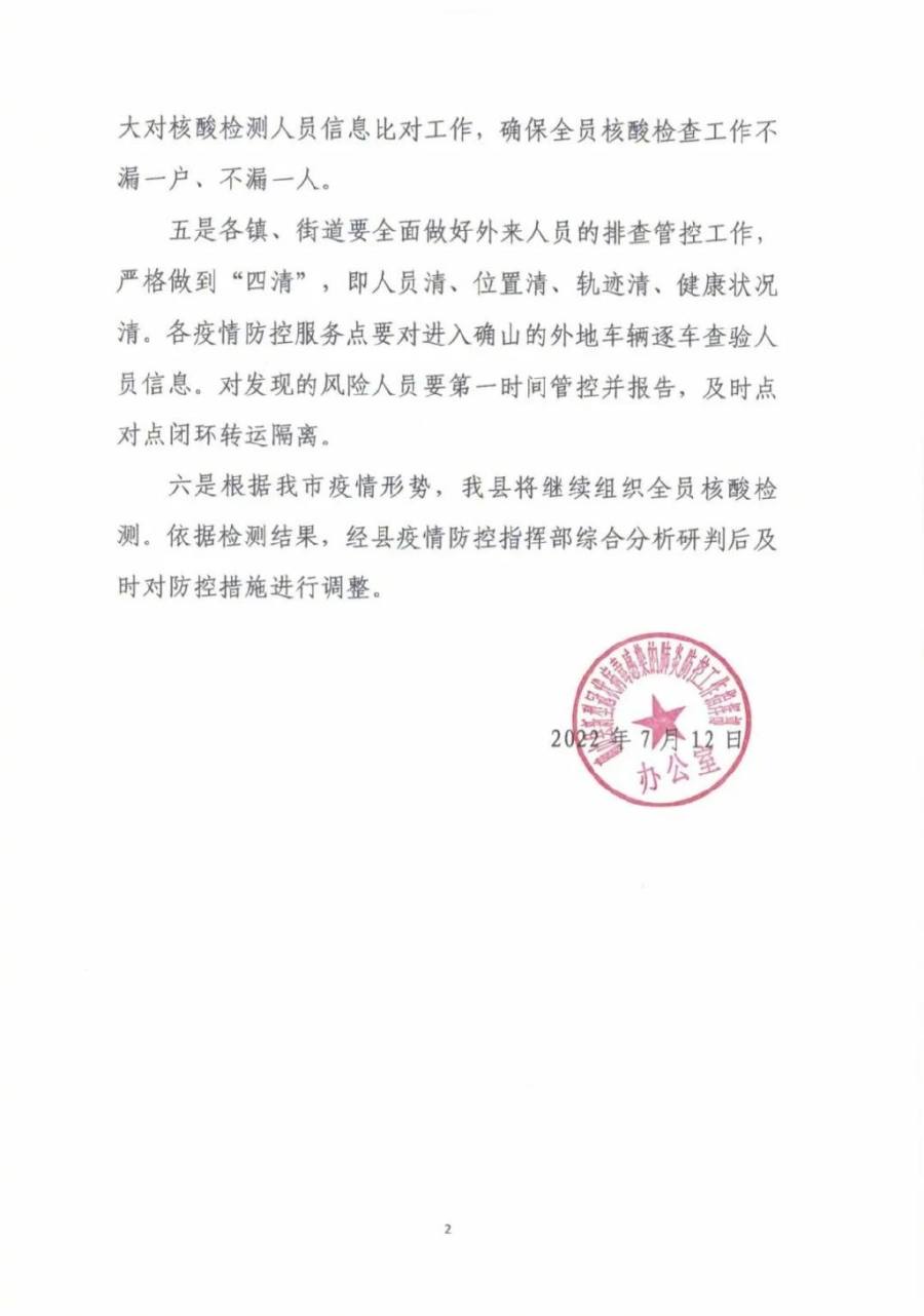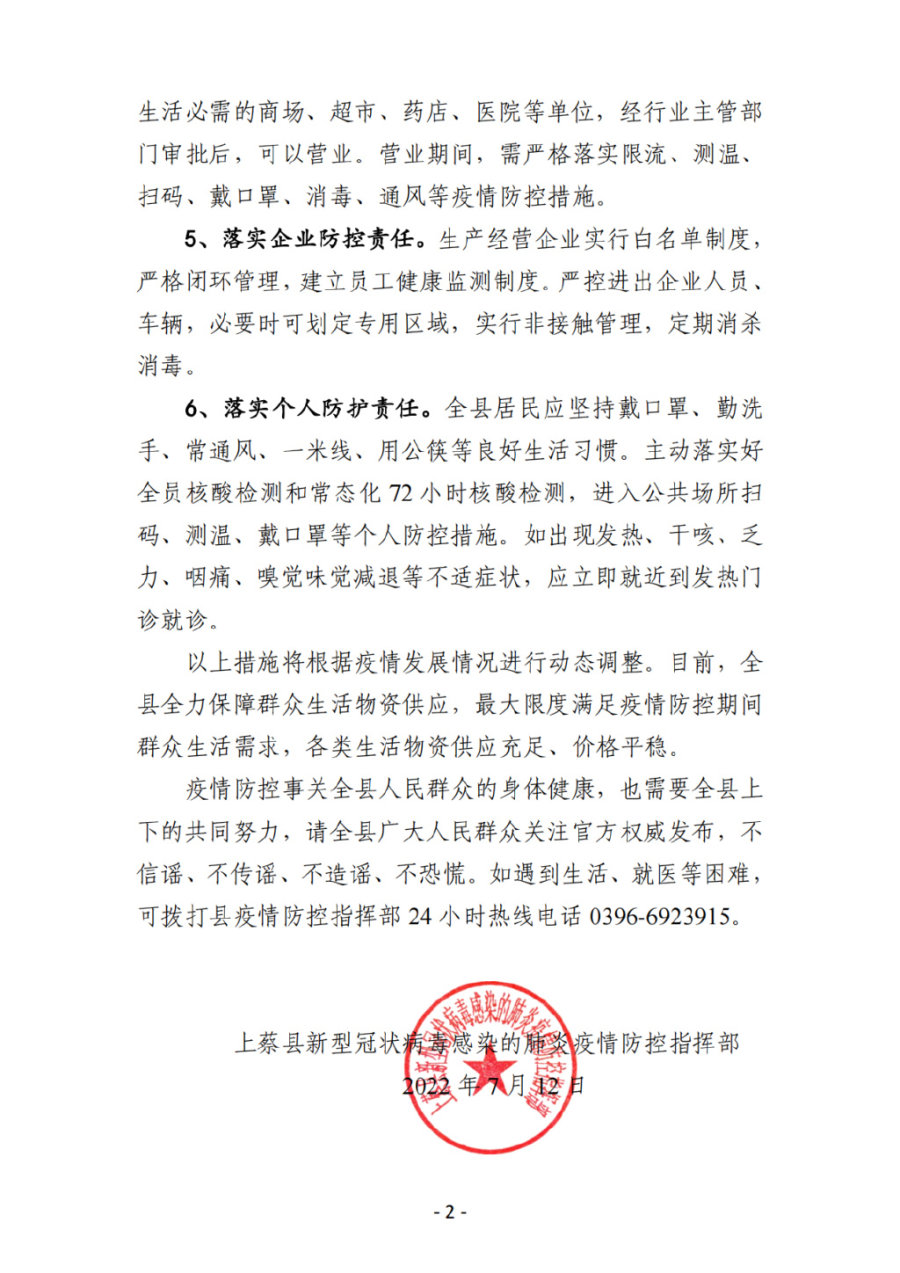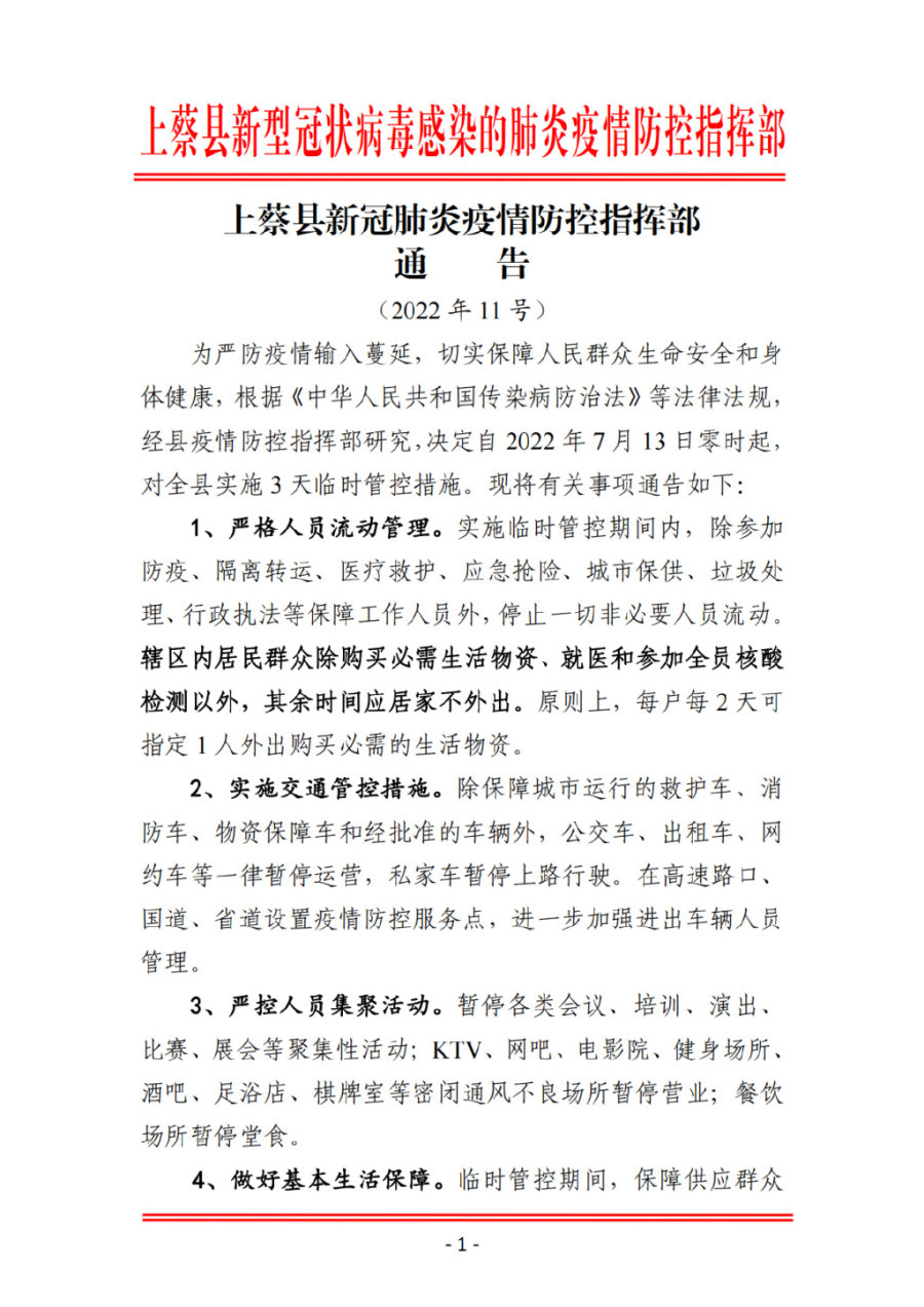 按照驻马店市疫情防控指挥部统一部署,为严防疫情发生 进一步传播扩散,切实保障人民群众生命安全和身体健康,经县疫情防控指挥部研究,决定自2022年7月13日0时至2022年7月15日24 时,在全县范围内实施3天临时管控措施。现将有关事项公告如下: