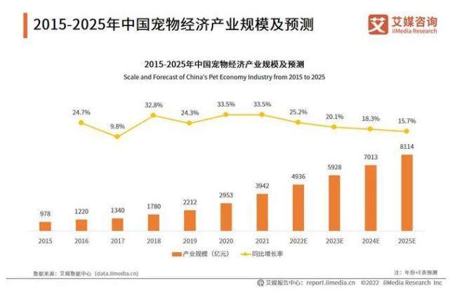 近年来,我国养宠人士逐年增多。《2021年中国宠物行业白皮书》显示,2021年我国饲养犬猫的人群数量达到6844万人,其中近一半是九零后宠物主。庞大的养宠人群,助力我国宠物市场规模呈爆发式增长。《2022-2023年中国宠物产业发展及消费者调研研究报告》显示,2022年中国宠物经济产业规模将同比增长25.2%至4936亿元,预计2025年市场规模达8114亿元。