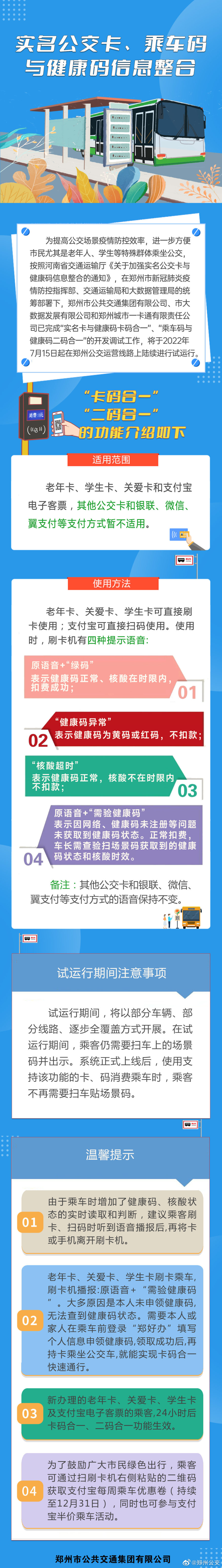 为提高公交场景疫情防控效率,进一步方便市民尤其是老年人、学生等特殊群体乘坐公交,按照河南省交通运输厅《关于加强实名公交卡与健康码信息整合的通知》,在郑州市新冠肺炎疫情防控指挥部、交通运输局和大数据管理局的统筹部署下,郑州市公共交通集团有限公司、市大数据发展有限公司和郑州城市一卡通有限责任公司已完成“实名卡与健康码卡码合一”、“乘车码与健康码二码合一”的开发调试工作,将于2022年7月15日起在郑州公交运营线路上陆续进行试运行。