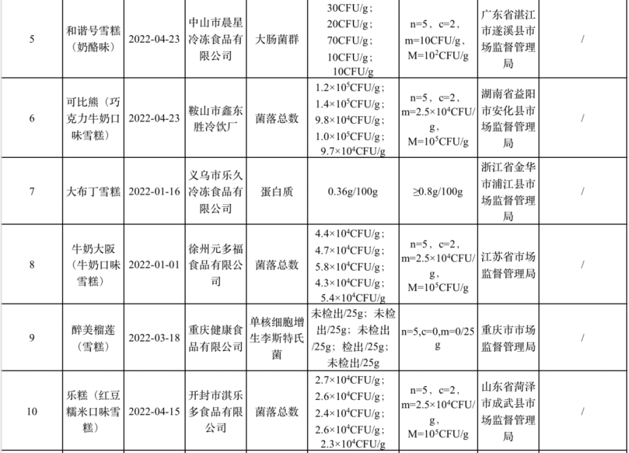 入夏以来,市场监管总局要求各地市场监管部门加强对雪糕等冷冻饮品的监管,进一步加大对雪糕生产经营企业的监督检查和雪糕产品的监督抽检力度。据初步统计,2022年上半年,各级市场监管部门共组织监督抽检3137批次雪糕产品,检验项目包括蛋白质、甜蜜素、糖精钠、阿斯巴甜、菌落总数、大肠菌群、沙门氏菌、单增李斯特菌等。其中,检出不合格样品15批次(见附件),不合格项目为菌落总数、大肠菌群、单增李斯特菌和蛋白质。抽检不合格的主要原因,是生产加工过程卫生条件控制不到位,或者产品在运输、贮存、销售环节不规范操作引起的微生物污染。对发现问题的企业和不合格产品,属地市场监管部门均已依法处置。
