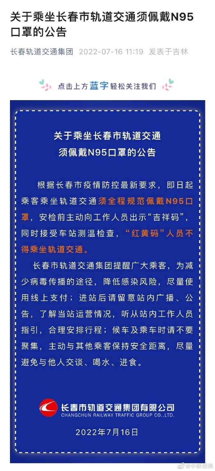 7月16日,长春轨道交通集团发布《关于乘坐长春市轨道交通须佩戴N95口罩的公告》:
