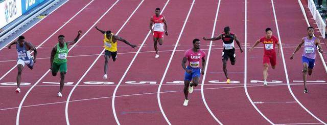 北京时间7月16日上午,中国选手苏炳添(右二)在俄勒冈世锦赛男子100米预赛中冲过终点