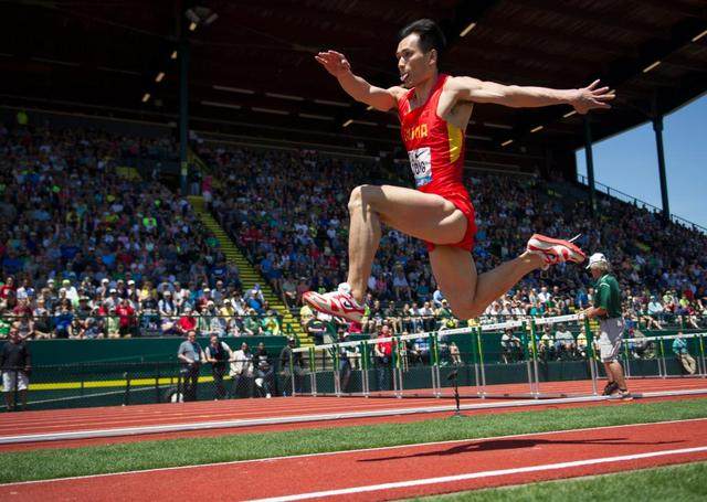 这是中国选手董斌在2016国际田联钻石联赛尤金站男子三级跳远比赛中