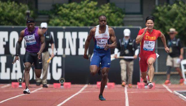 这是2015年钻石联赛尤金站男子100米比赛中的苏炳添(右)