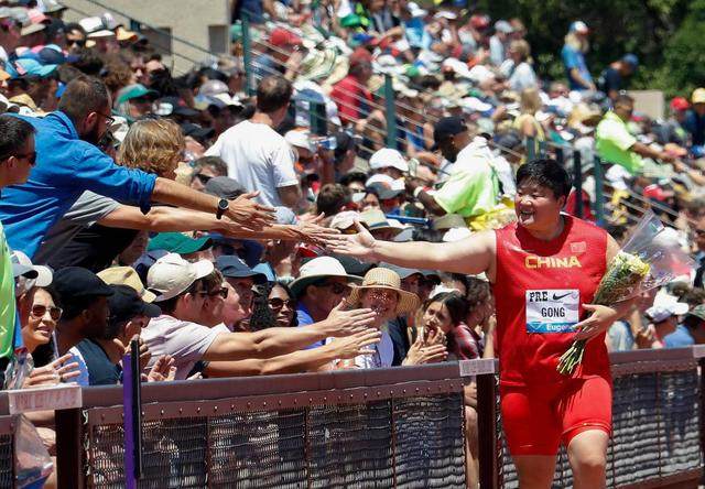 2019年6月30日,巩立姣在当年的钻石联赛尤金站夺冠后与观众击掌庆祝