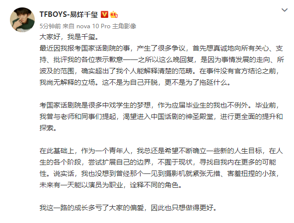 最近因我报考国家话剧院的事,产生了很多争议,首先想真诚地向所有关心、支持、批评我的各位表示歉意——之所以这么晚回复,是因为事情发展的走向、所波及的范围,确实超出了我个人能解释清楚的范畴。在事件没有官方结论之前,我尚无解释的立场。这不是为自己开脱,更不是为了拖延什么。