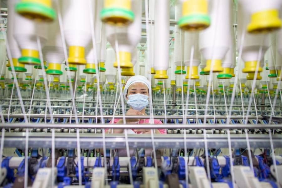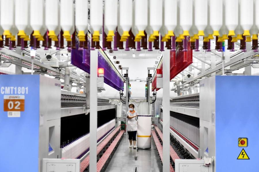 7月15日,江苏省海安市南莫镇一家纺织公司生产车间内,工人在生产线上工作。(新华社发,翟慧勇摄)
