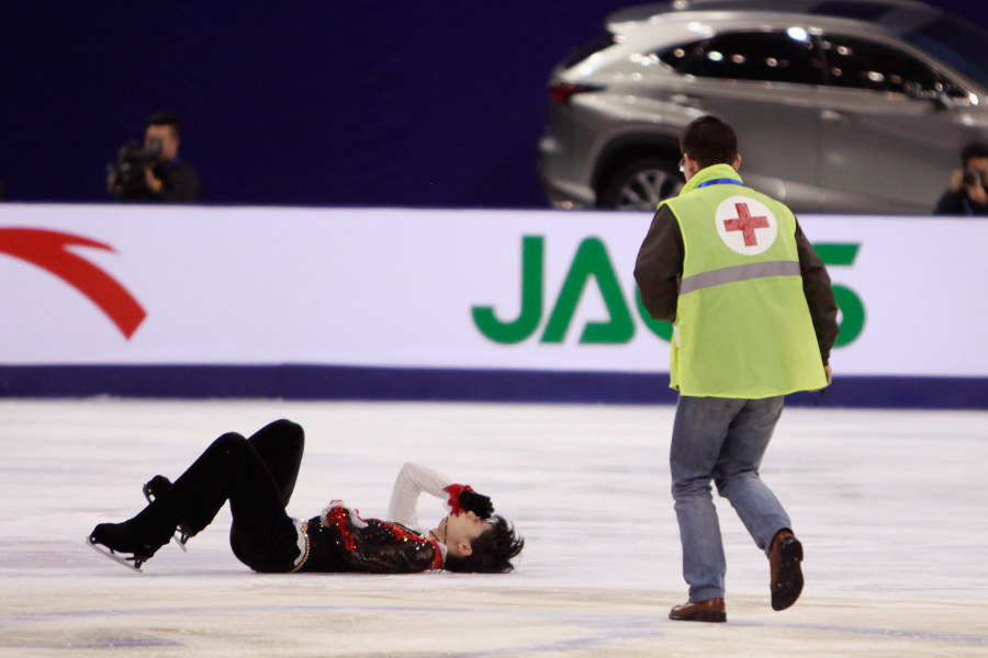 赛前热身,羽生结弦和卫冕冠军、中国的闫涵不慎相撞——闫涵的下巴磕到了羽生结弦的额头以及太阳穴,两人痛苦倒地。