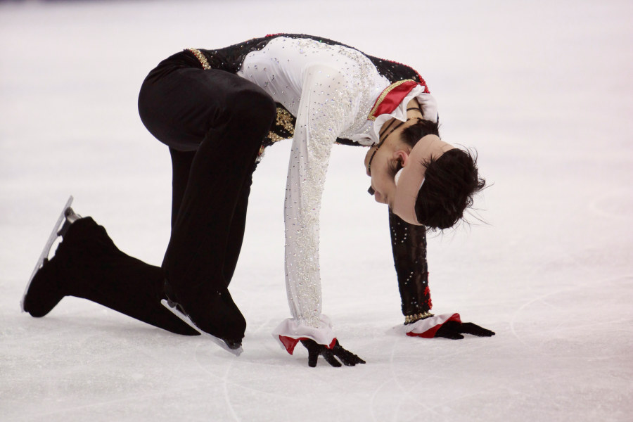 在现场,羽生几次挣扎着想站起来,但却始终无法起身……当时他的教练让他放弃比赛,但经过简单包扎后,羽生只说了一句——“跳”,就走上了赛场。