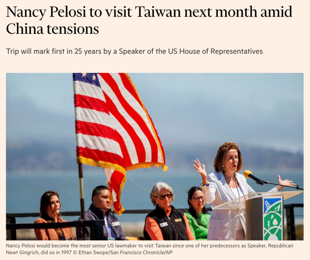 据《金融时报》19日援引六名知情人士的话报道称,美国众议院议长南希·佩洛西计划于8月率团窜访台湾,“以表达对台北的支持”。