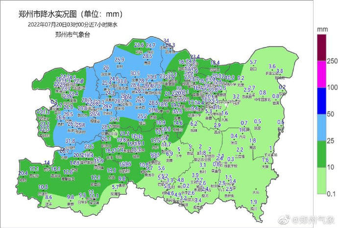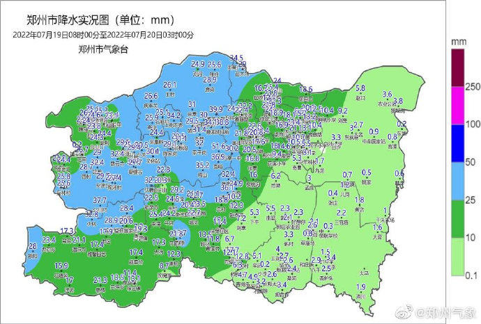 过程降水量:2022年07月19日08时00分至2022年07月20日03时00分,郑州市出现中到大雨。最大降水出现在荥阳市的槐林51.6毫米。最大小时雨强22.2毫米(出现在荥阳市的槐林站19日09时49分至19日10时49分)。降水量在50.0-99.9毫米的站点有1个,25.0-49.9毫米的站点有57个,10.0-24.9毫米的站点有83个。雨量较大的站点有(毫米):荥阳市的槐林51.6,豫龙小学39.9,贾峪36.9;上街区的上街农委34.2,五云山28.5,石咀村25.1;巩义市的公川村37.7,南岭34.8,慈云寺32.4;惠济区的炎黄广场34.5,苗木场29.0,四中北校25.4;中原区的林科所38.8,阳光小学22.6,建设路小22.6;高新区的万科小学24.2,春藤路 22.4,外国语 22.2;二七区的马寨一中30.2,尖岗20.5,郑州国家站18.0;登封市的少林32.8,嵩山站28.9,纸坊28.4;新密市的牌坊沟36.1,平陌33.7,黄帝岭32.4;金水区的绿城小学24.0,丽水23.8,四十七中23.4;管城区的气象局14.6,绿之声10.7,花溪小学9.4;郑东新区的普惠13.1,商鼎路10.4,锦绣小学10.4;经开区的十一中10.6,实验中学5.8,瑞锦小学5.5;新郑市的柿树行6.3,后湖6.2,辛店5.1;中牟县的刘集9.2,赵口5.8,狼城岗3.8;航空港区的岗李3.4,八千2.9,香炉朱2.5。