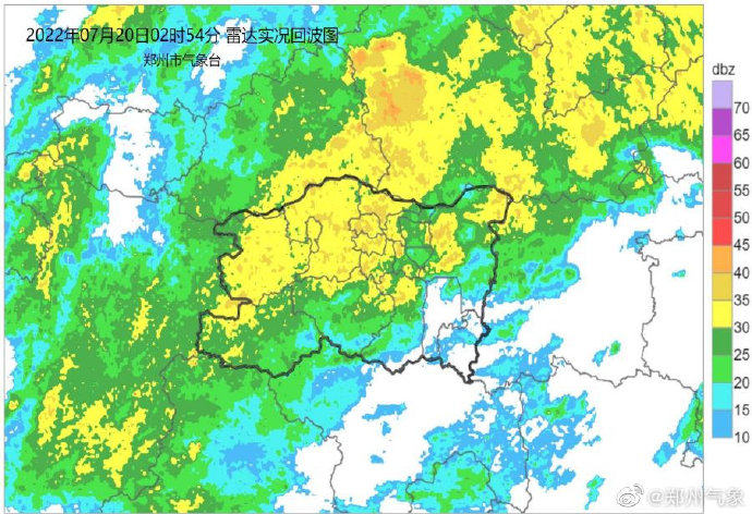 雷达回波:2022年07月20日02时54 分,巩义、荥阳、郑州主城区、中牟等地有降水回波,最大回波强度 44-49dBZ。