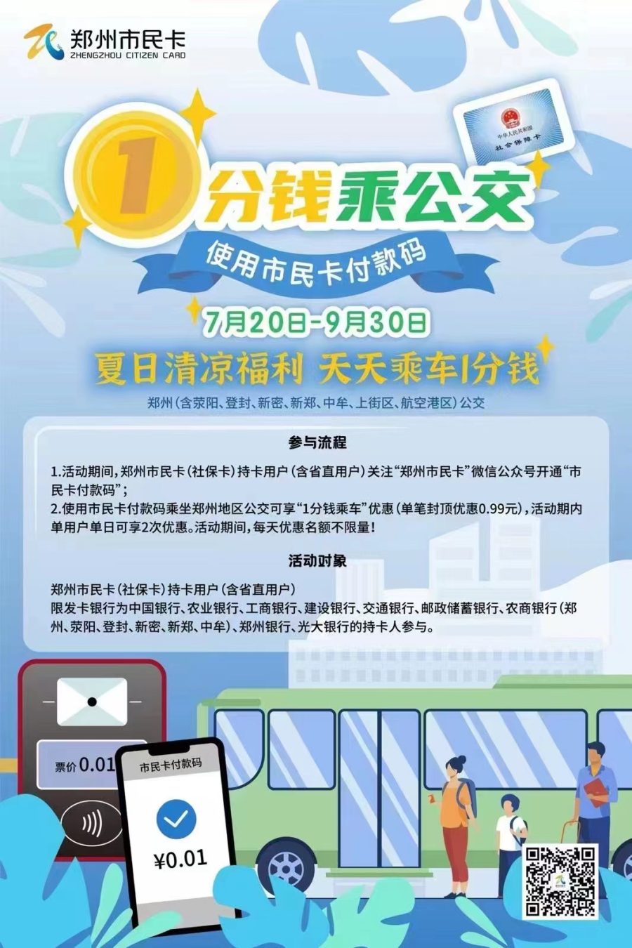 据了解,本次社保卡(市民卡)“一分钱乘公交”活动将从7月20日持续至9月30日,使用社保卡(市民卡)付款码乘坐郑州(含荥阳、登封、新密、新郑、中牟、上街区、航空港区)公交车可享最低“1分钱乘车”优惠(单笔优惠0.99元),每天优惠名额不限量,活动期内每位用户每天可享2次优惠。发卡银行为中国银行、农业银行、工商银行、建设银行、交通银行、邮政储蓄银行、农商银行(郑州、荥阳、登封、新密、新郑、中牟)、郑州银行、光大银行的郑州社保卡(市民卡)持卡用户(含省直用户)均可参与。