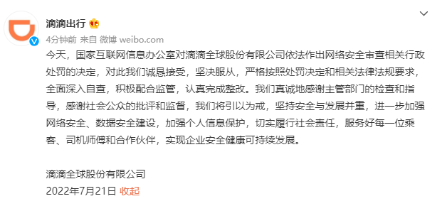 今天,国家互联网信息办公室对滴滴全球股份有限公司依法作出网络安全审查相关行政处罚的决定,对此我们诚恳接受,坚决服从,严格按照处罚决定和相关法律法规要求,全面深入自查,积极配合监管,认真完成整改。我们真诚地感谢主管部门的检查和指导,感谢社会公众的批评和监督,我们将引以为戒,坚持安全与发展并重,进一步加强网络安全、数据安全建设,加强个人信息保护,切实履行社会责任,服务好每一位乘客、司机师傅和合作伙伴,实现企业安全健康可持续发展。