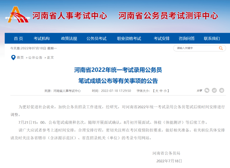 为更好促进社会就业,加快公务员招录工作进度,经研究,对河南省2022年统一考试录用公务员笔试后续时间安排进行调整。7月21日15:00公布笔试成绩和名次,随即开展面试确认,8月初开展面试、体检(体能测评)等后续工作。