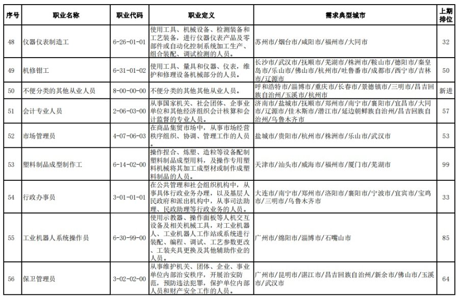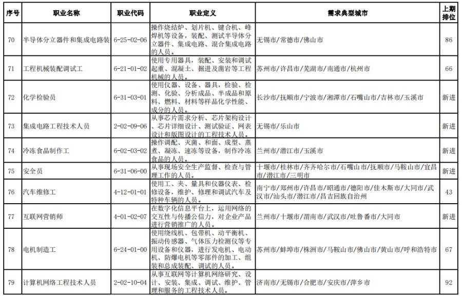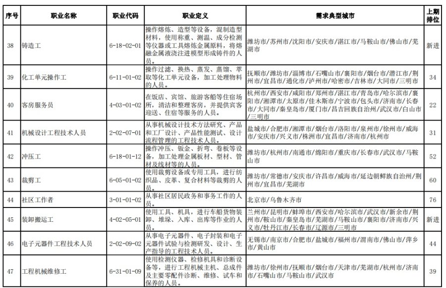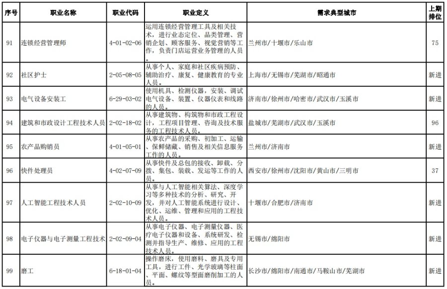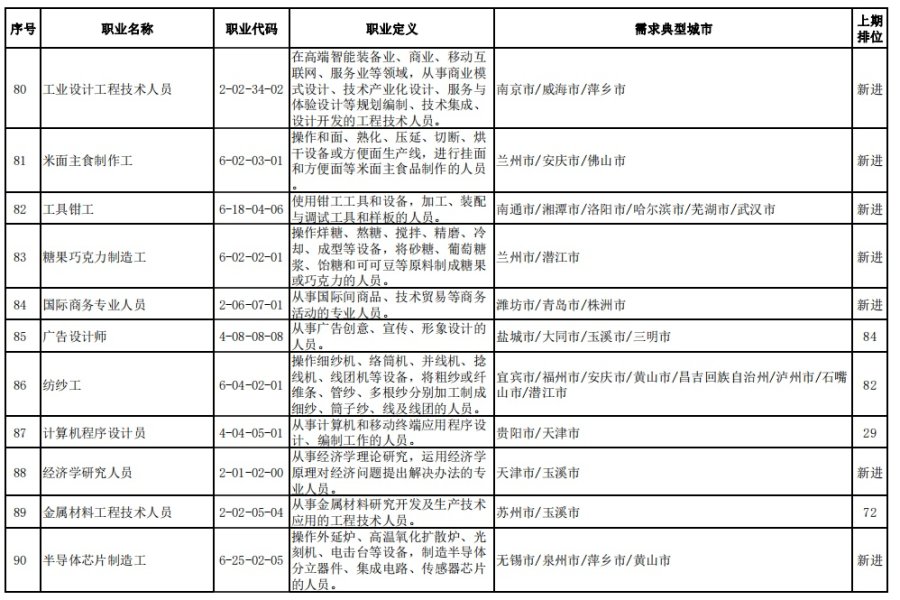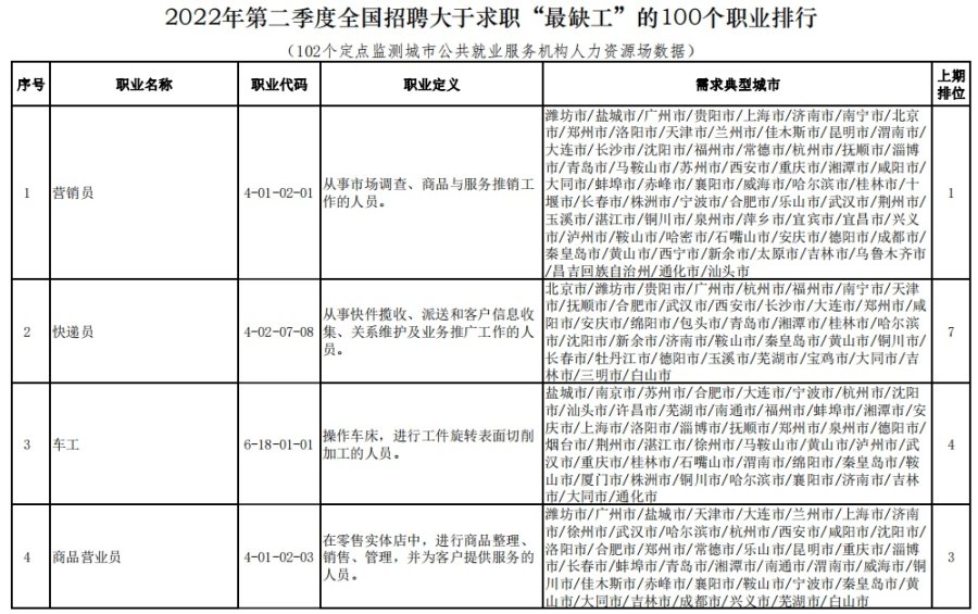 据人社部消息,中国就业培训技术指导中心近期组织102个定点监测城市公共就业服务机构,收集汇总2022年第二季度人力资源市场供求关系较为紧张的招聘、求职需求职业岗位信息,形成“2022年第二季度全国招聘大于求职‘最缺工’的100个职业排行”。