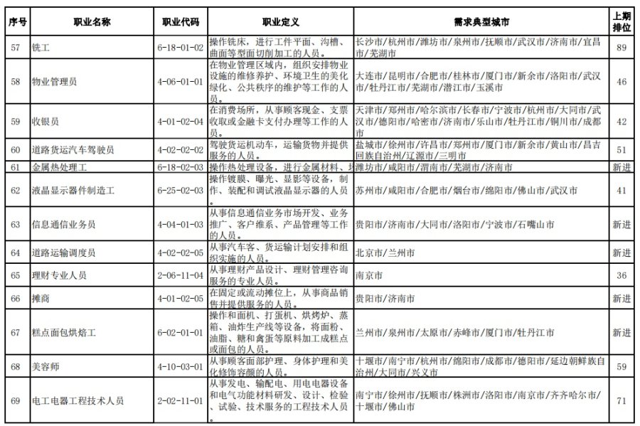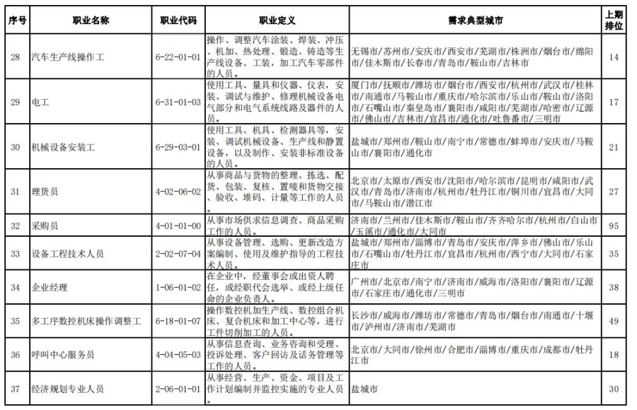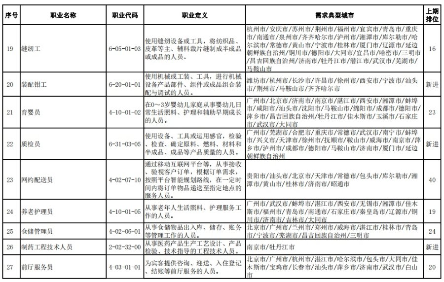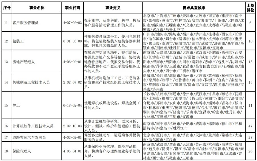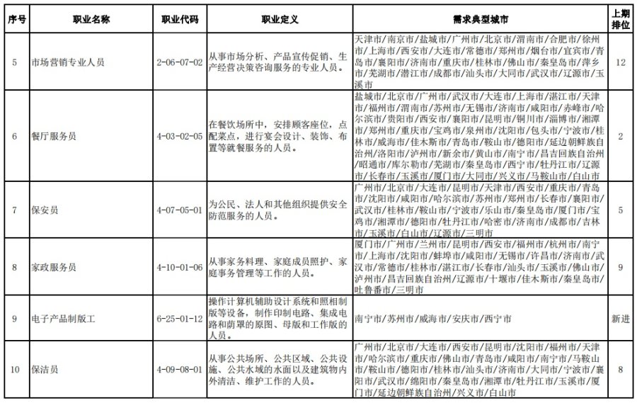 前十位职业分别为营销员、快递员、车工、商品营业员、市场营销专业人员、餐厅服务员、保安员、家政服务员、电子产品制版工、保洁员。