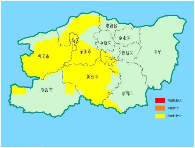 郑州市自然资源和规划局、郑州市气象局联合发布汛期地质灾害气象预报预警,23日晚到24日,郑州市地质灾害气象风险预警达到黄色预警的地区为:荥阳、巩义、新密、上街大部,登封西北部、东北部及北部局部,二七区西部及南部,新郑西北部及西南部,惠济区西部局部,发生地质灾害的可能性较大。
