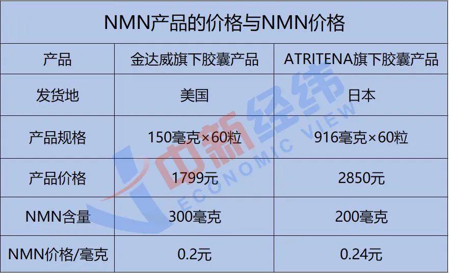 上述两款产品换算下来,前者每两粒含NMN300毫克,每毫克NMN的价格约0.2元,每千克售价为20万元;后者每粒含200毫克NMN,每毫克NMN0.24元,每千克售价24万元。