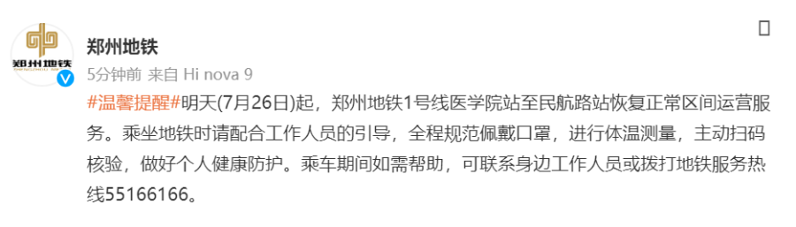 明天(7月26日)起,郑州地铁1号线医学院站至民航路站恢复正常区间运营服务。乘坐地铁时请配合工作人员的引导,全程规范佩戴口罩,进行体温测量,主动扫码核验,做好个人健康防护。乘车期间如需帮助,可联系身边工作人员或拨打地铁服务热线55166166。