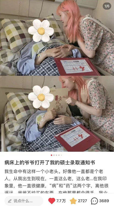 这个出生于1999年的女孩,被保送研究生后,拿着录取通知书给病床上84岁的爷爷一个惊喜,拍了照片和视频发到社交平台作纪念。